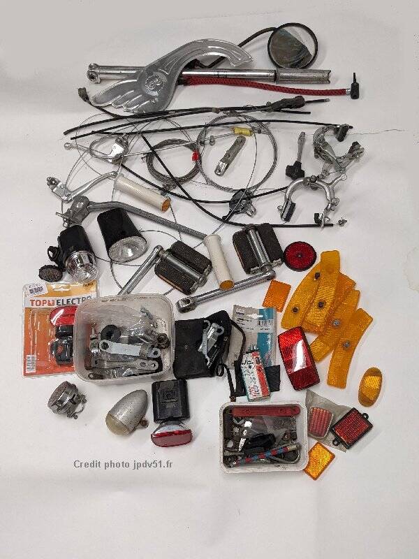 Ce lot s’adresse aux bricoleurs qui adorent améliorer, entretenir et réparer les engins à pédales grands ou petits, de ville, tout terrain ou de course. Dans ce lot se trouvent des accessoires modernes et d’autres qui sont plutôt vintage. Inventaire difficile à produire, mais tout ce qui est visible sur les photos sera du voyage vers vous et ce qui y sera en plus sera cadeau.